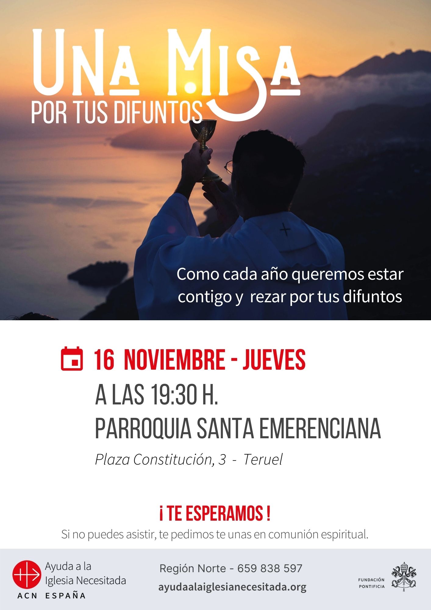 El jueves ,16 de noviembre, se va a celebrar en Santa Emerenciana la Misa de Difuntos que Ayuda a la Iglesia Necesitada. Será a las siete y media de la tarde.