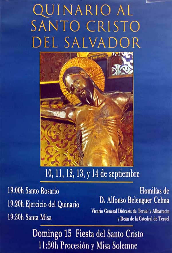 Los días 10, 11, 12, 13 y 14 de septiembre, a las siete de la tarde, en la Iglesia del Salvador de Teruel se rezará el Santo Rosario, se hará ejercicio del Quinario y la Misa con homilía, a cargo de don Alfonso Belenguer, Vicario General.