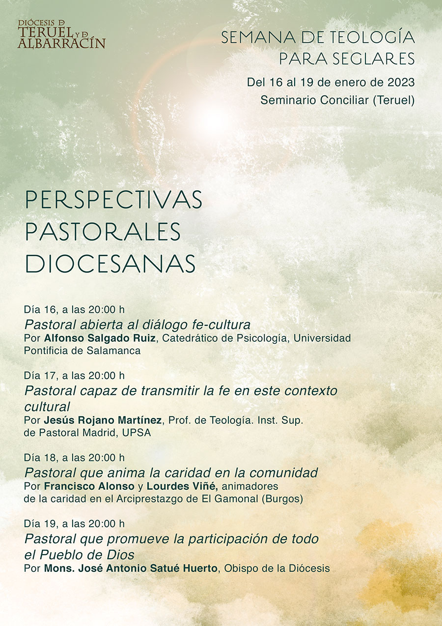 Seminario de Teruel Plaza Pérez Prado, Teruel, TeruelEl Instituto de Estudios Teológicos San Joaquín Royo de Teruel ha presentado el programa de la próxima Semana de Teología para Seglares. Serán del 15 al 18 de enero, en el salón de actos del Seminario de Teruel. Bajo el tema «Una espiritualidad para una Iglesia en misión» se desarrollará esta tradicional semana de formación. Programa: […]